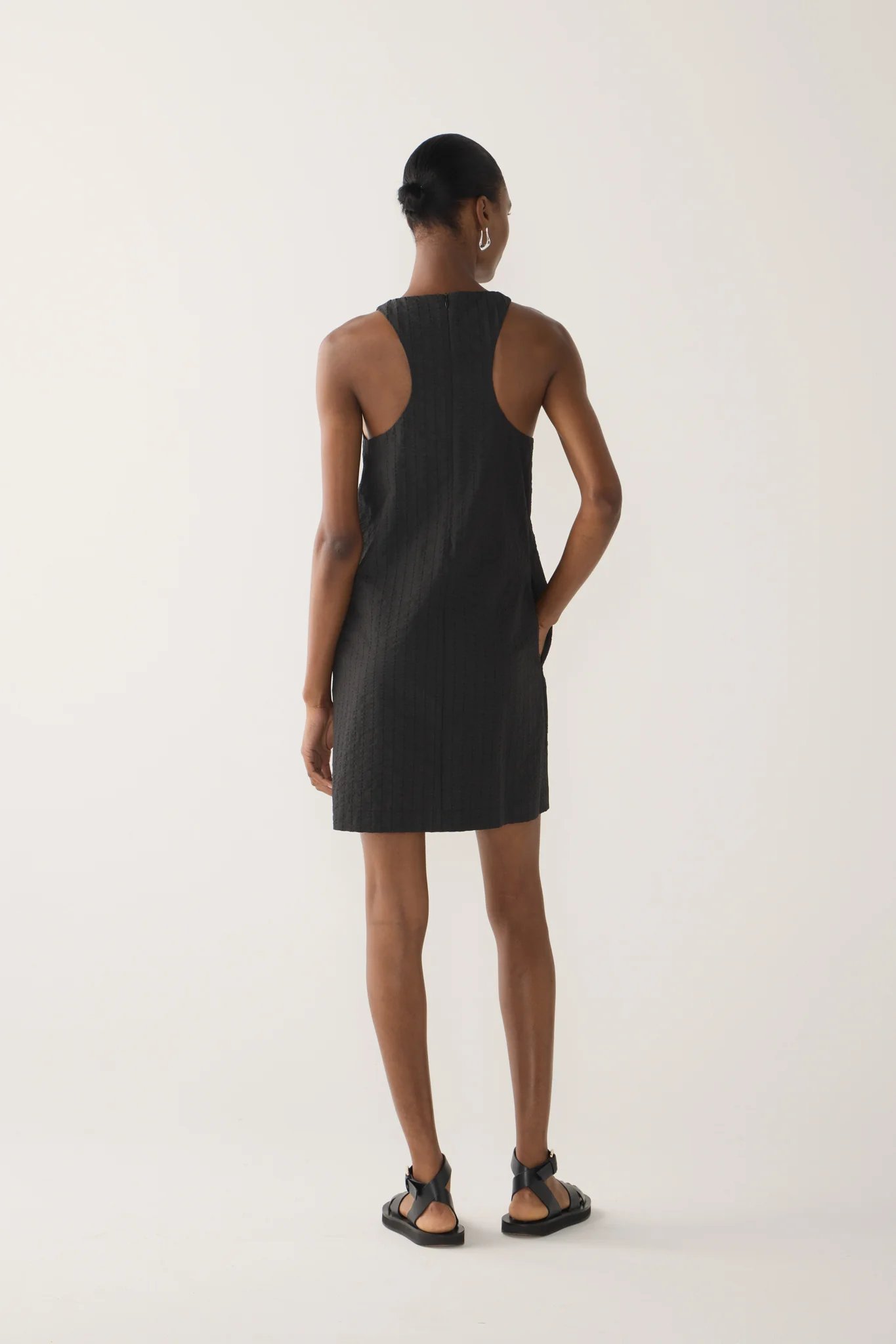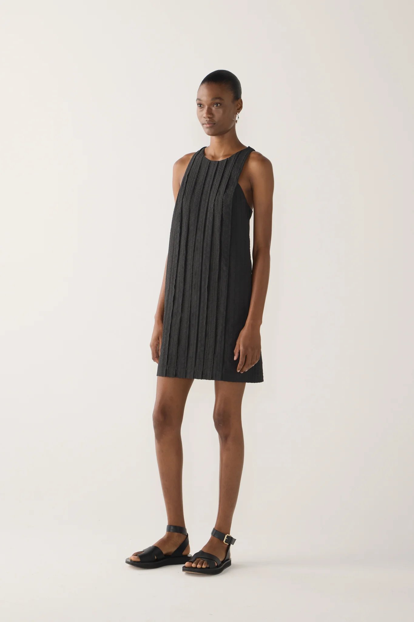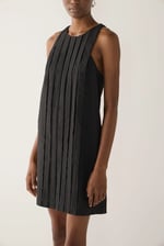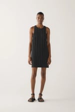 It features bold vertical pleats through the front for a structured silhouette, a racer back with an invisible zip, and side seam pockets for ease and practicality - a refined balance of simplicity and modern edge.