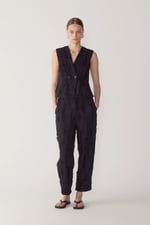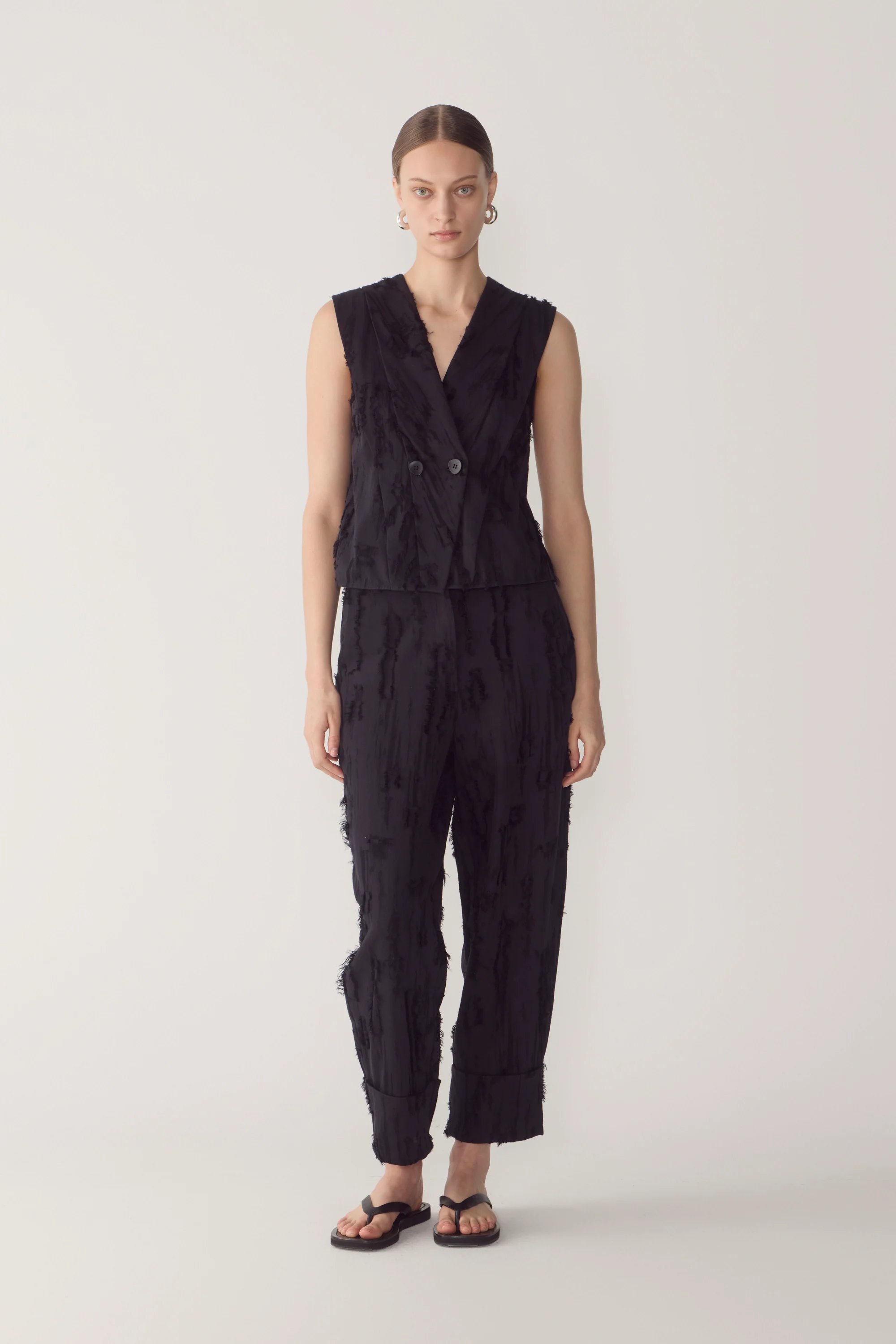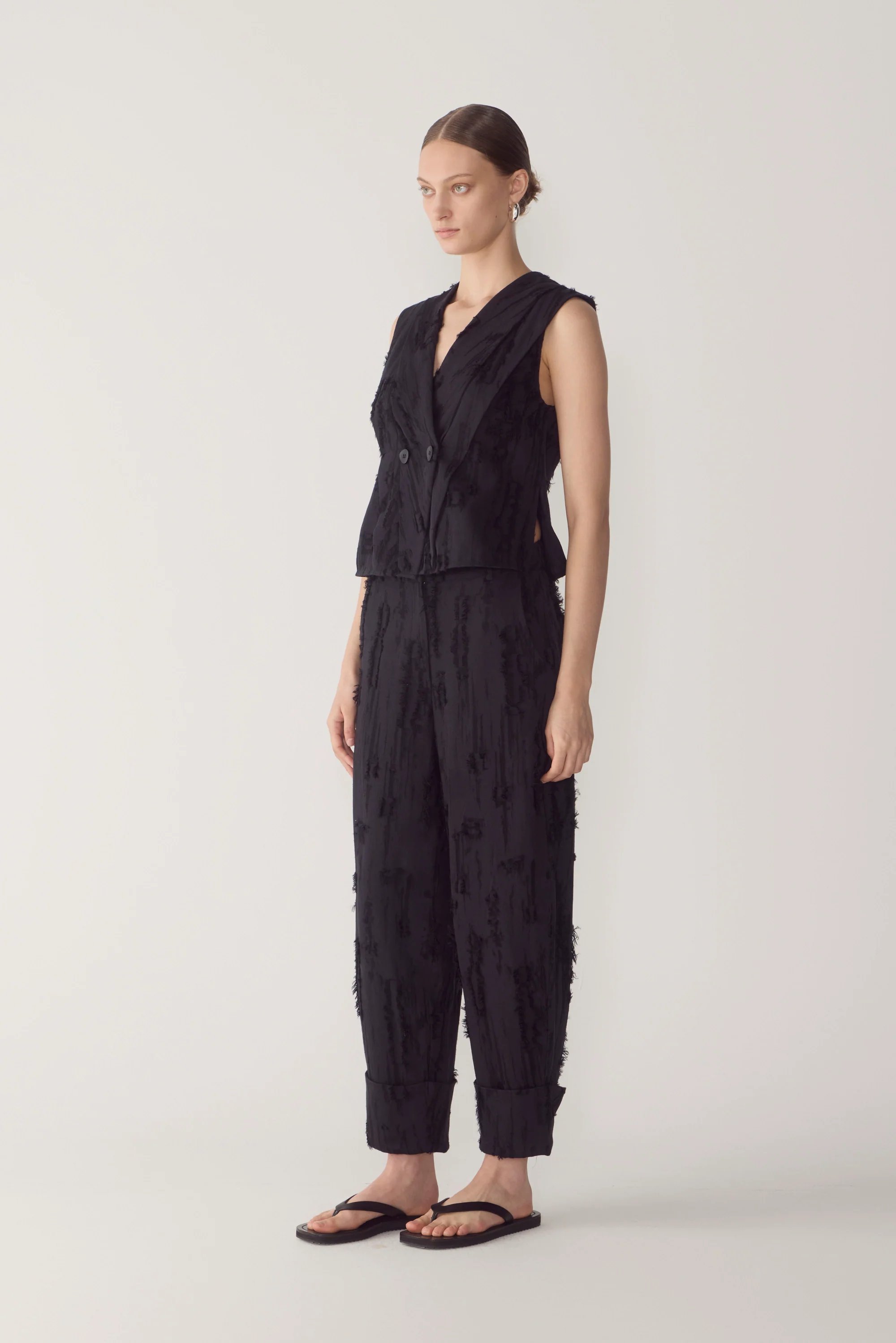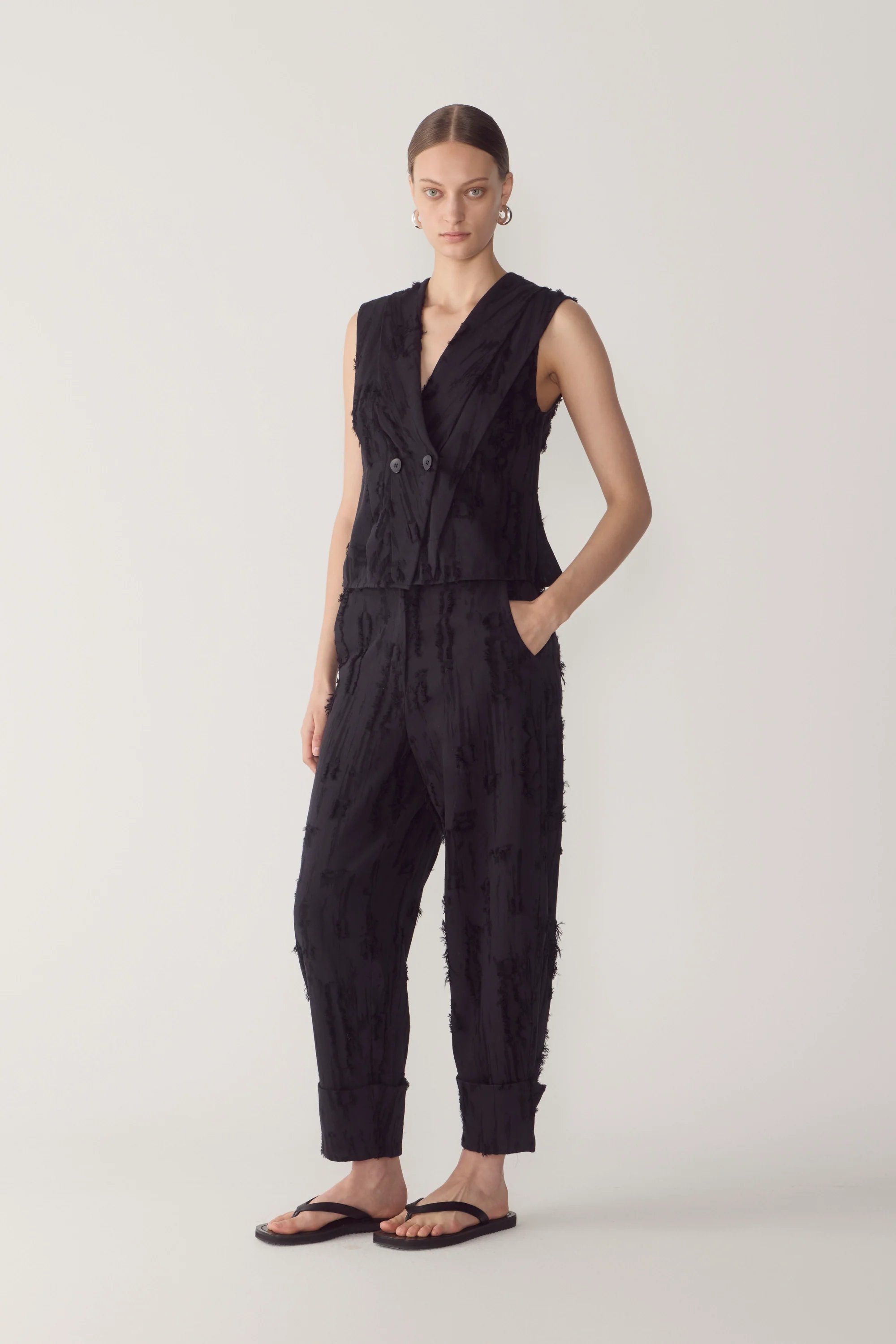 Crafted in a textured frayed jacquard for added depth and tactile character. Worn with the Mara Vest in Black.