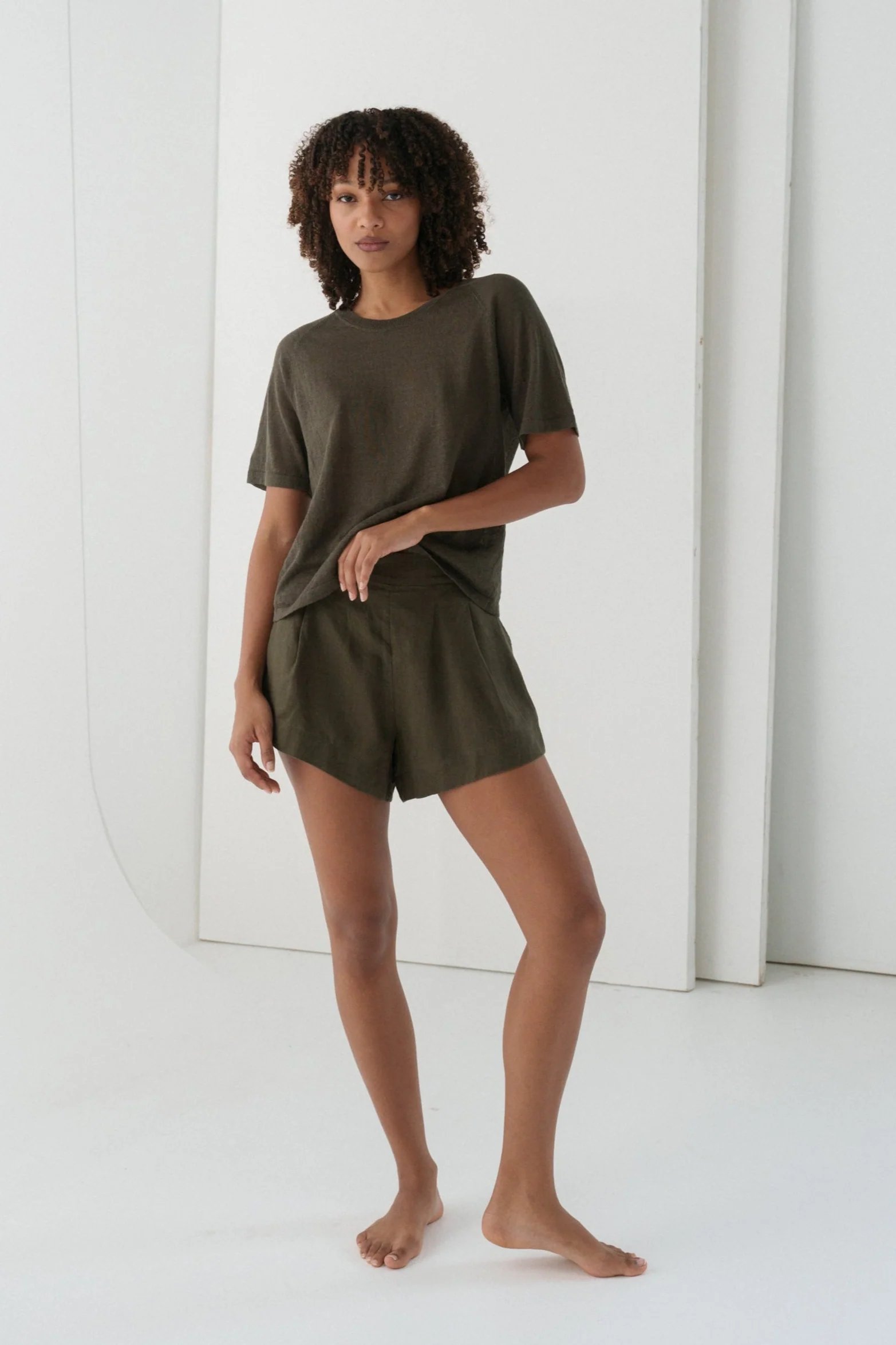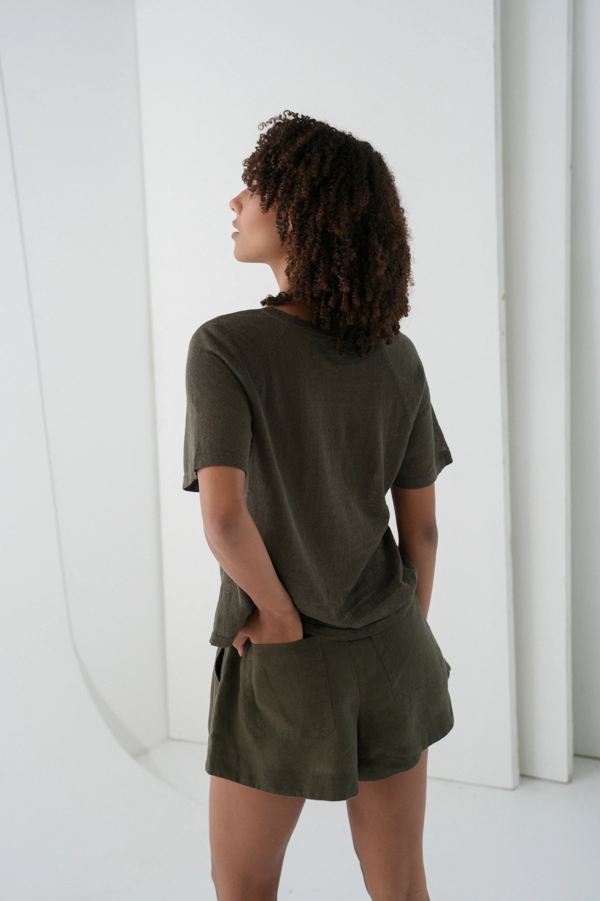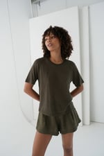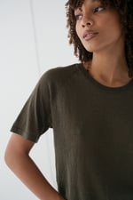 With a relaxed fit, raglan short sleeves, and a minimal silhouette, she’s easy to dress up or down.