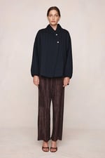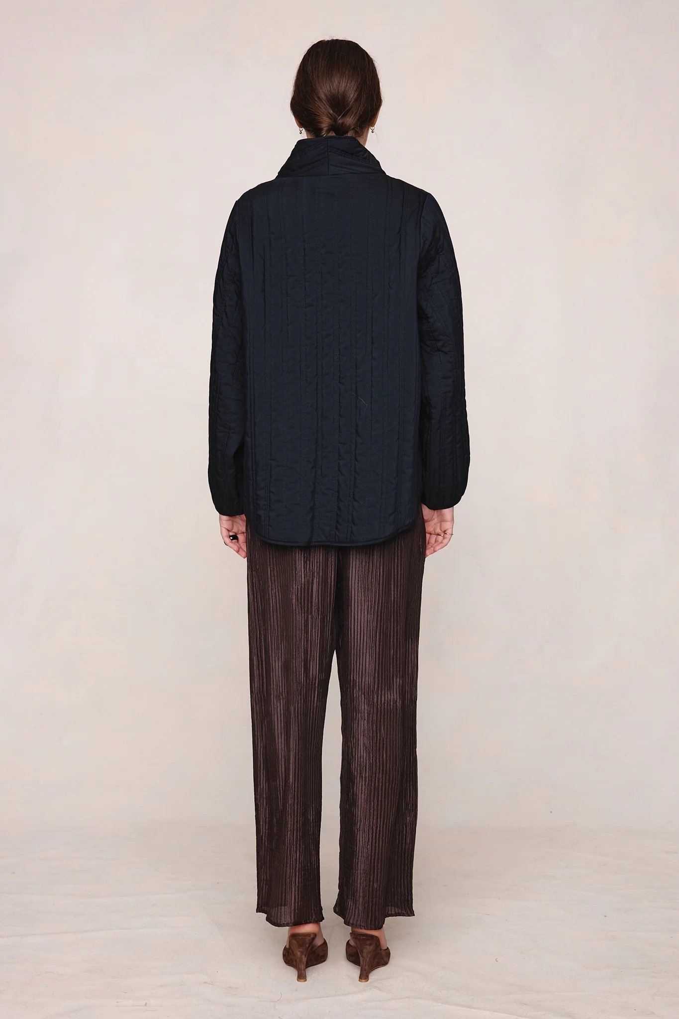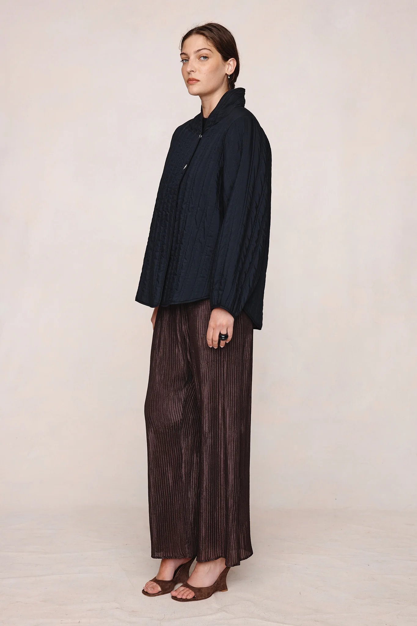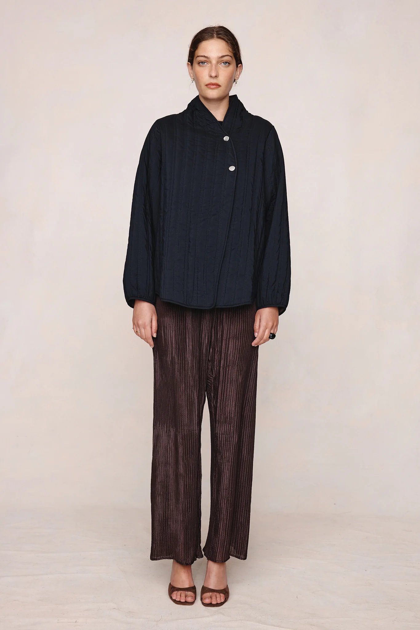 Quilted cropped style jacket with a relaxed cocoon shape, high collar, crossover dome fastening, voluminous sleeves, and reversible construction.