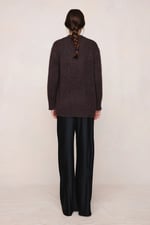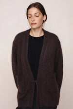 Dita cardigan in mohair–merino with an oversized shape, ribbed cuffs, front patch pockets, and a single adjustable tie fastening.