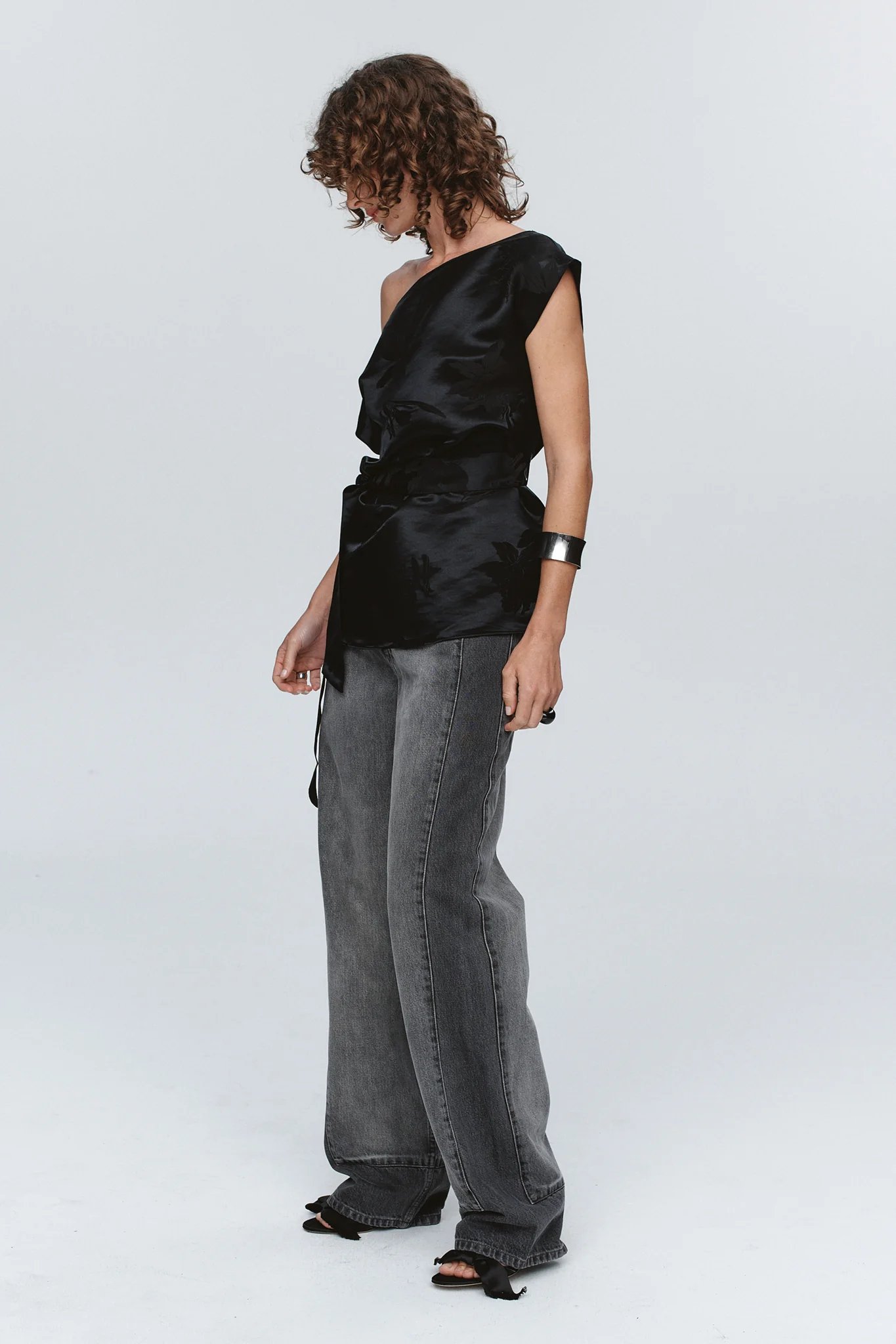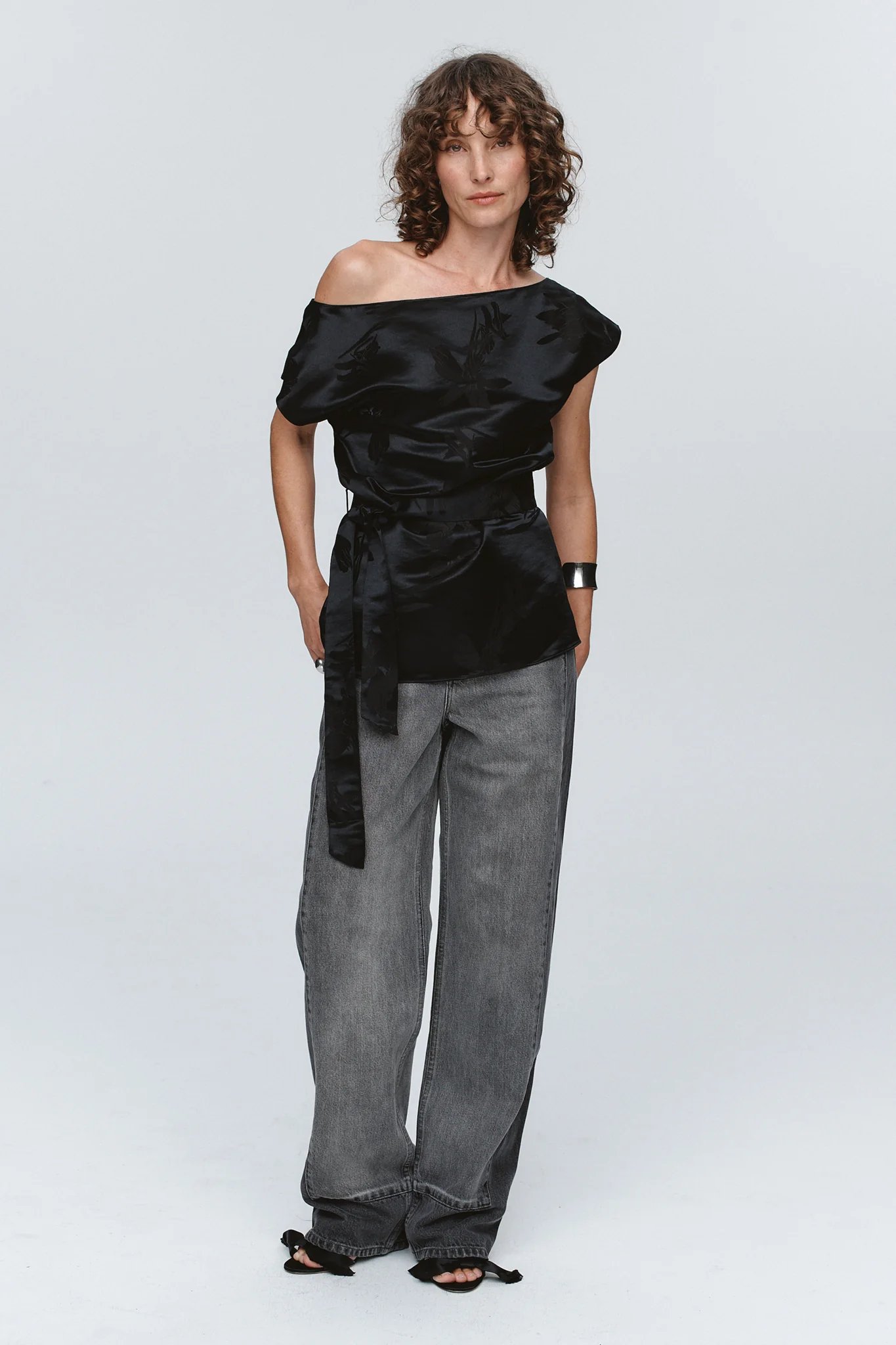 The tonal floral motif is woven into the fabric creating a rich depth that reveals itself up close. Designed to drape asymmetrically across the body, it falls off one shoulder. Clinched softly at the waist with a matching self-tie, creating structure without interrupting the fabric’s natural movement.
