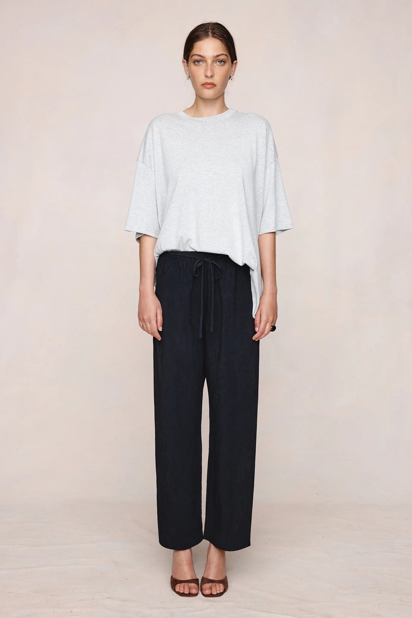 Lillie pant in lightweight 100% Tencel with a high-rise fit, thin elasticated waistband with exposed rouleau tie, straight leg gently tapering toward the ankle, and a semi-cropped length.