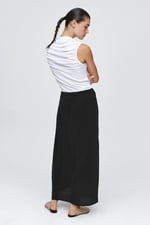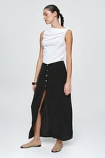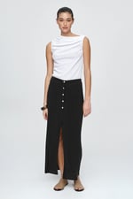 A button-through skirt cut from 100% silk for a fluid, elegant drape and natural sheen. A straight shape that softly skims the body and falls to the ankle. The front placket is finished with a line of 5 contrast shell buttons for closure. A subtle front slit adds movement and ease, while the waistband sits comfortably at the natural waist for a streamlined fit.
