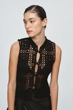 Constructed using a patchwork grid of geometric crochet motifs, the top showcases a refined interplay of texture and transparency. Featuring a stand collar and a front placket.