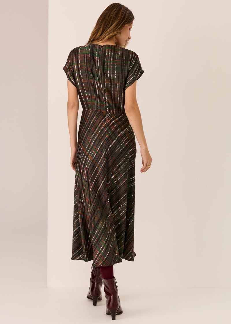 -Exclusive check Della print in shades of Charcoal, Green, Toffee and White.